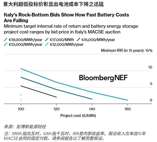 意大利首次大型儲(chǔ)能競(jìng)價(jià)的投標(biāo)價(jià)創(chuàng)下紀(jì)錄低點(diǎn),僅為每年12,000-19,000歐元(13,300-21,000美元)/MWh,遠(yuǎn)低于預(yù)期,彰顯電池成本正大幅下降。在全球供應(yīng)格局變化和價(jià)格競(jìng)爭(zhēng)激烈的背景下,開發(fā)商似乎愿意接受接近于零的回報(bào)底線,以確保長(zhǎng)期合同。