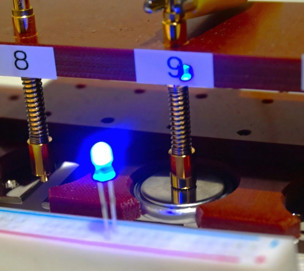 采用新型非晶氧化物陰極的紐扣型鎂電池原型,成功點(diǎn)亮藍(lán)色發(fā)光二極管。圖片來(lái)源:日本東北大學(xué)