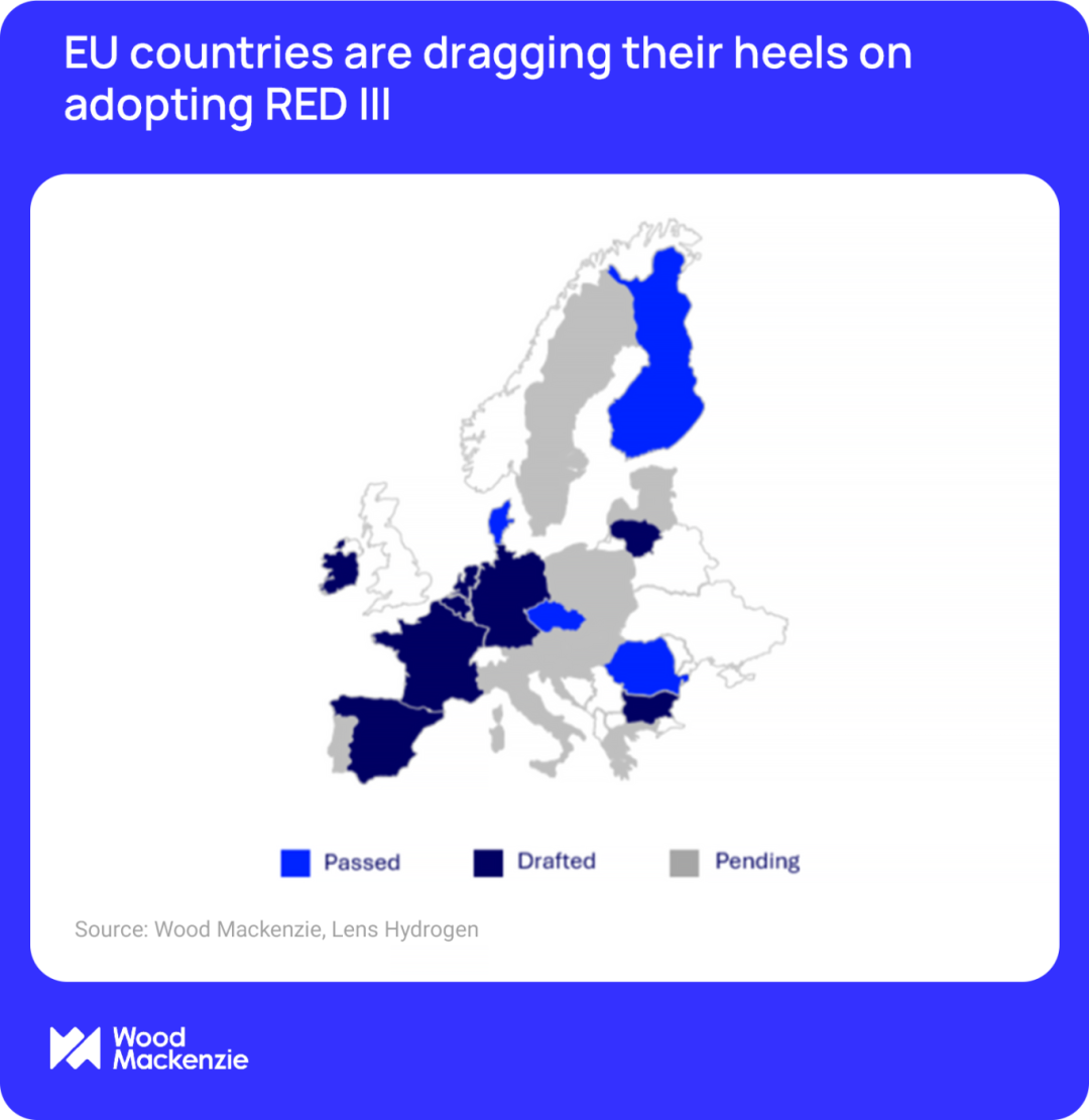 將RED III相關(guān)要求轉(zhuǎn)化為各成員國(guó)國(guó)內(nèi)法律的進(jìn)展遲緩,這對(duì)投資決策造成阻礙,削弱了市場(chǎng)信心。由于各成員國(guó)缺乏明確的國(guó)內(nèi)法規(guī),項(xiàng)目開(kāi)發(fā)商無(wú)法評(píng)估業(yè)務(wù)的可行性,也無(wú)法獲取融資,更難以開(kāi)展跨境合作項(xiàng)目。
