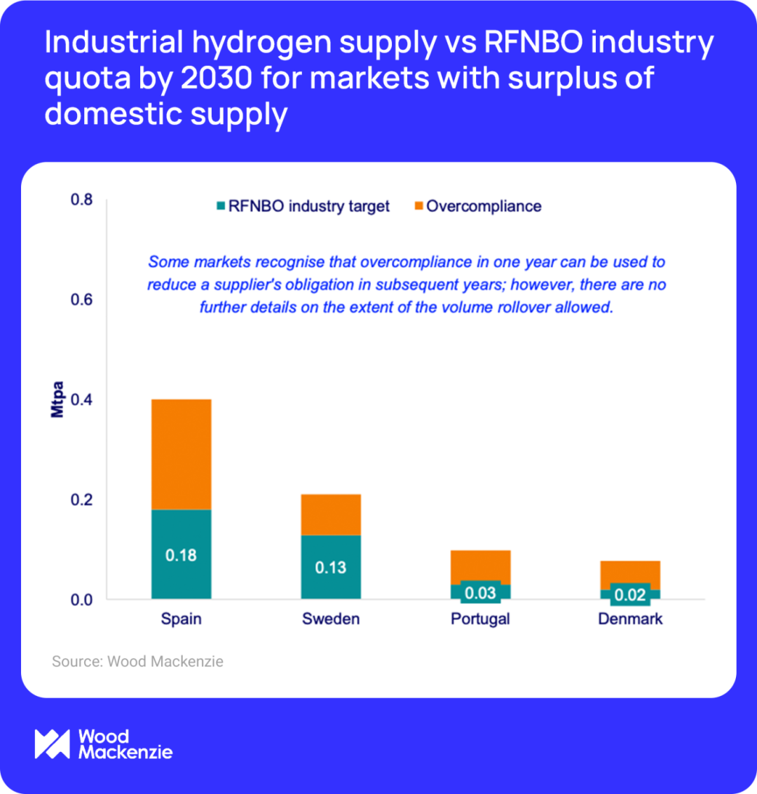 在運(yùn)輸領(lǐng)域,合規(guī)路徑似乎更為明確,處罰措施能向市場(chǎng)釋放清晰信號(hào)。煉油廠路徑正逐漸成為實(shí)現(xiàn)合規(guī)的首選方式,但并非所有煉油廠都已落實(shí)RFNBO的供應(yīng)渠道和配套基礎(chǔ)設(shè)施。就工業(yè)目標(biāo)而言,歐盟多數(shù)國(guó)家有能力實(shí)現(xiàn)42%的RFNBO配額要求。然而,各國(guó)在將指令轉(zhuǎn)化為國(guó)內(nèi)法律方面進(jìn)展遲緩,這讓項(xiàng)目開(kāi)發(fā)商持續(xù)面臨不確定性。伍德麥肯茲分析指出,進(jìn)口對(duì)于滿足工業(yè)配額至關(guān)重要。在歐盟成員國(guó)中,僅有西班牙、瑞典、葡萄牙和丹麥能夠依靠國(guó)內(nèi)過(guò)剩產(chǎn)能完成配額任務(wù)。