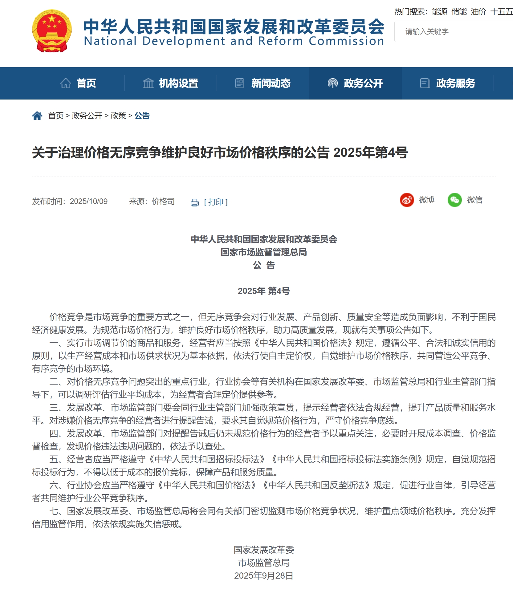 兩部門發(fā)布《關(guān)于治理價(jià)格無序競(jìng)爭(zhēng)維護(hù)良好市場(chǎng)價(jià)格秩序的公告》