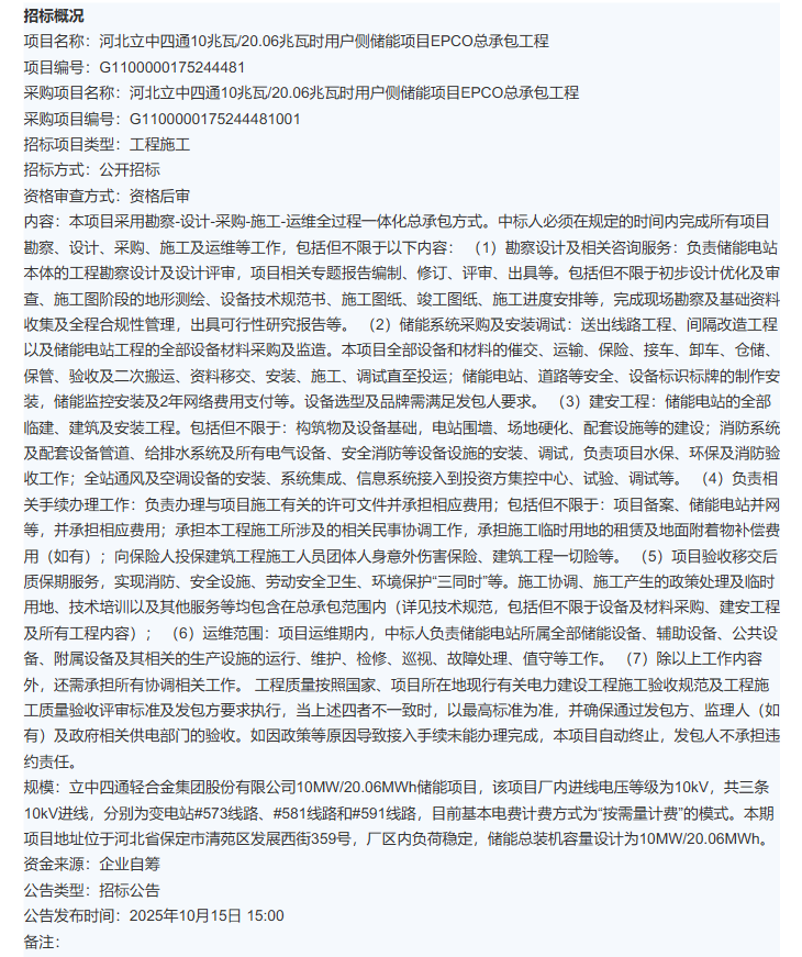 中國儲能網(wǎng)訊:10月15日,中開新能源(深圳)有限公司發(fā)布河北立中四通10兆瓦/20.06兆瓦時用戶側(cè)儲能項目EPCO總承包工程招標公告,本項目采用勘察-設(shè)計-采購-施工-運維全過程一體化總承包方式。中標人必須在規(guī)定的時間內(nèi)完成所有項目勘察、設(shè)計、采購、施工及運維等工作。