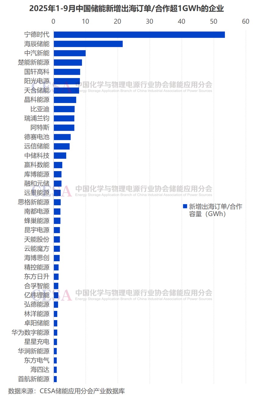 據(jù)CESA儲(chǔ)能應(yīng)用分會(huì)數(shù)據(jù)庫(kù)統(tǒng)計(jì),2025年1-9月,中國(guó)儲(chǔ)能新增出海訂單/合作總規(guī)模達(dá)214.7GWh,同比增長(zhǎng)131.75%。其中,海外訂單在5GWh以上的企業(yè)分別是:寧德時(shí)代53.51GWh、海辰儲(chǔ)能21.57GWh、中汽新能10.05GWh、楚能新能源8.84GWh、國(guó)軒高科8.26GWh、陽(yáng)光電源8.25GWh、天合儲(chǔ)能7.97GWh、晶科能源7.06GWh、比亞迪6.54GW、瑞浦蘭鈞6.50GWh、阿特斯6.45GWh、德賽電池5.33GWh、遠(yuǎn)信儲(chǔ)能5.00GWh,海外訂單在1GWh以上的企業(yè)就更多了。