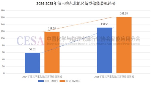 東北地區(qū)作為我國重要的能源基地,擁有豐富的風(fēng)光資源,新能源裝機規(guī)模持續(xù)增長。據(jù)CESA儲能應(yīng)用分會產(chǎn)業(yè)數(shù)據(jù)庫不完全統(tǒng)計,2025年前三季度我國東北地區(qū)新型儲能裝機規(guī)模為130.55MW/161.28MWh,同比增長123%(功率)/36.6%(容量)。