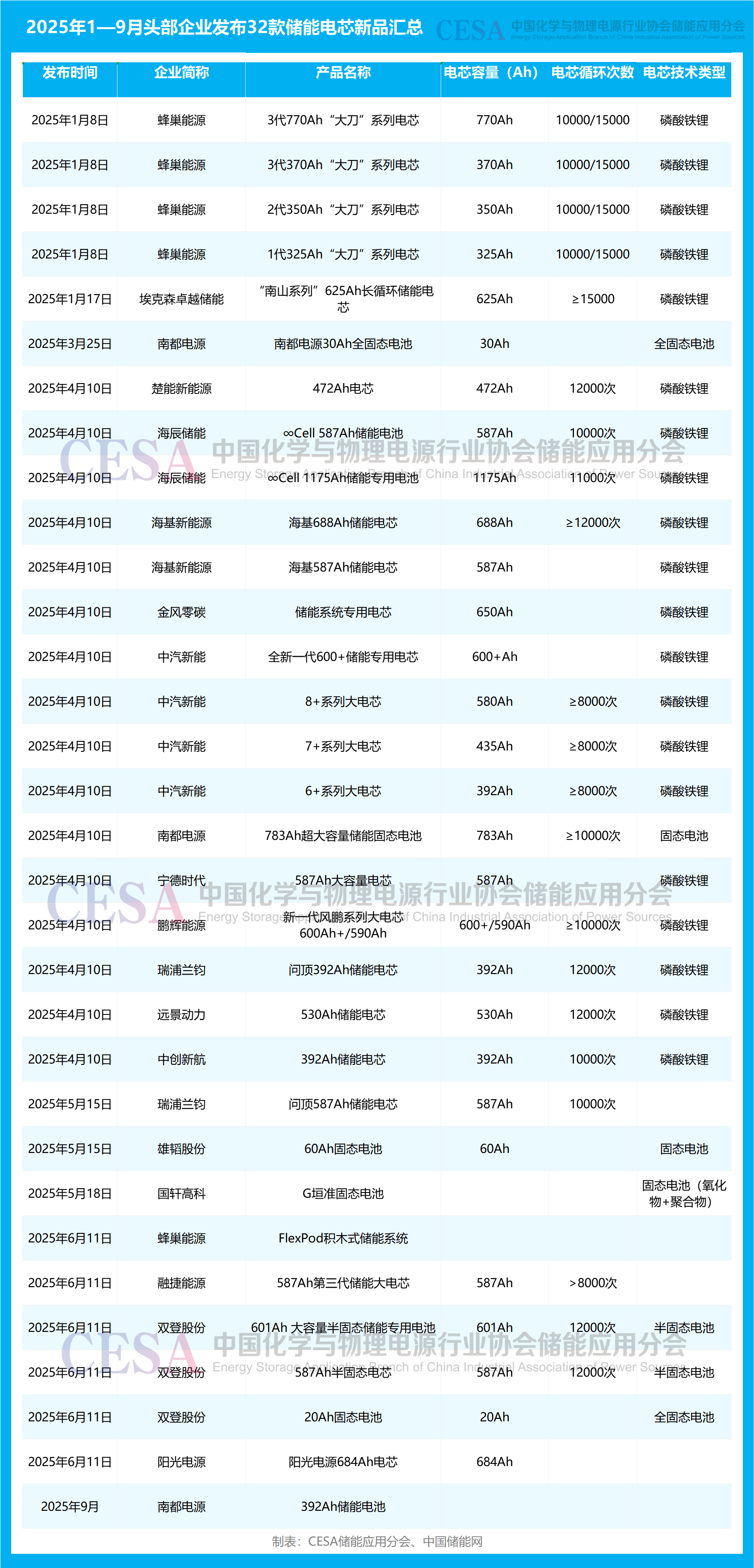 據(jù)CESA儲(chǔ)能應(yīng)用分會(huì)產(chǎn)業(yè)數(shù)據(jù)庫(kù)不完全統(tǒng)計(jì),截止2025年1—9月蜂巢能源、中汽新能、南都電源、雙登股份等18家頭部企業(yè)共發(fā)布32款儲(chǔ)能電芯新品。