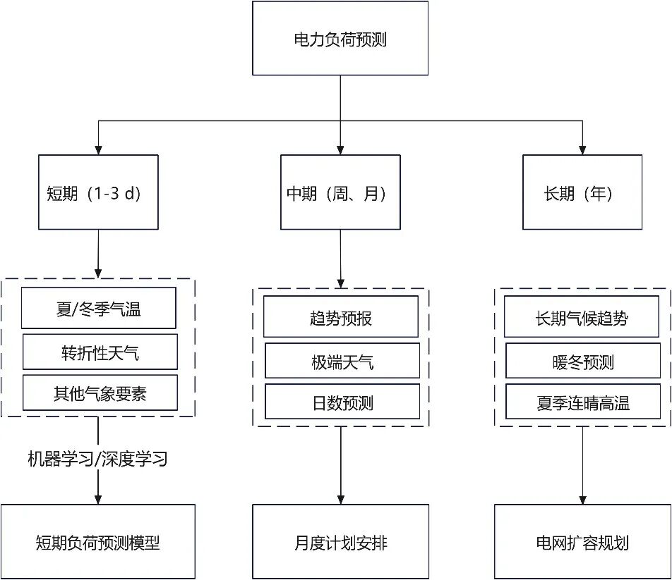 用電負荷伴隨著經(jīng)濟的發(fā)展持續(xù)增長,氣象與電力負荷的耦合波動也不斷增強。為了分析氣象因子與負荷之間的非線性關系,國內(nèi)外學者開展了大量研究,發(fā)現(xiàn)電力負荷與體感溫度、累計溫度、降水、風速等氣象因子的關聯(lián)度很高,這些氣象條件會直接影響不同地區(qū)及時間段的用電負荷。目前,氣象服務在短期、中期和長期電力負荷預測中均有廣泛應用,基于精細化電力監(jiān)測數(shù)據(jù),利用統(tǒng)計方法、數(shù)值模式和AI模型,可以實現(xiàn)對電力負荷的精準預測,輔助調(diào)度策略的制定。