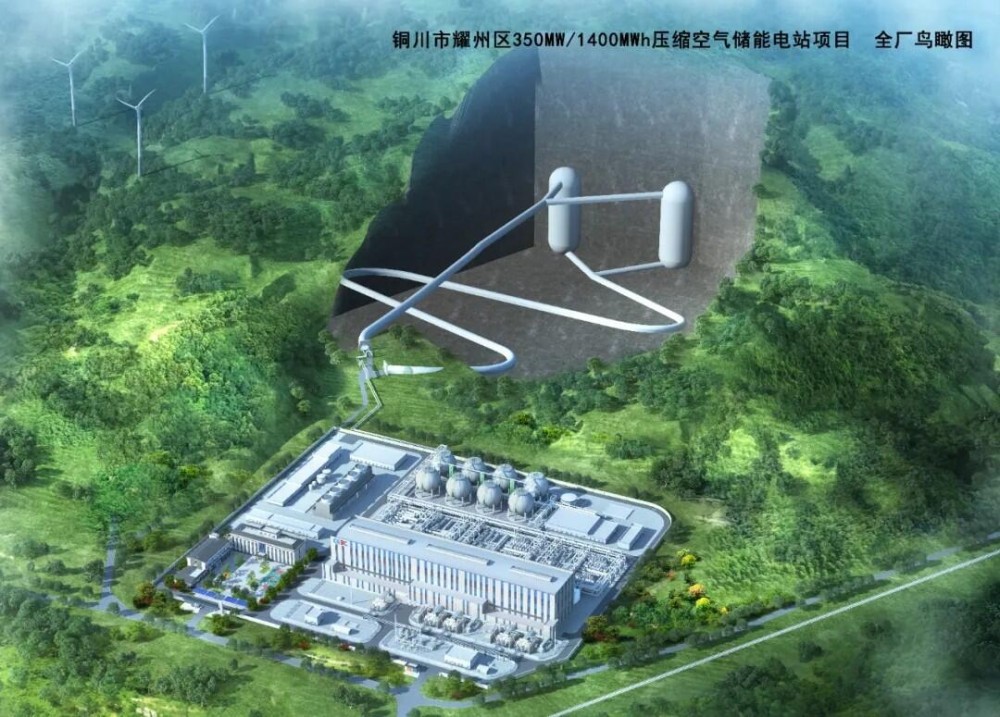 該項(xiàng)目位于陜西省銅川市耀州區(qū),是世界首例在石灰?guī)r地層選址及世界首臺(tái)大罐式350兆瓦級(jí)人工硐室壓縮空氣儲(chǔ)能電站項(xiàng)目。儲(chǔ)能容量達(dá)1400兆瓦時(shí),儲(chǔ)能6小時(shí),釋能4小時(shí),計(jì)劃日“兩充兩放”,年運(yùn)行天數(shù)達(dá)330天,年最大發(fā)電量約9.24億度。