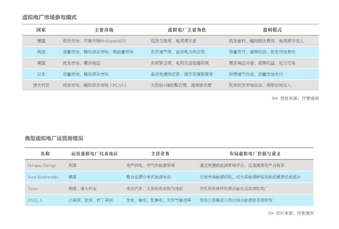 最后,各國建立了引導(dǎo)虛擬電廠運行的市場機制。德國電力市場以“平衡單元”機制為核心,虛擬電廠可參與日前市場、日內(nèi)市場、輔助服務(wù)市場及再調(diào)度2.0(Redispatch 2.0),獲取調(diào)節(jié)補償;英國構(gòu)建容量市場、輔助服務(wù)市場與零售電價機制,鼓勵虛擬電廠參與容量投標和頻率響應(yīng)等服務(wù)。美國PJM、CAISO等區(qū)域市場中,虛擬電廠通過需求響應(yīng)和現(xiàn)貨競價參與市場。澳大利亞國家電力市場(NEM)統(tǒng)一現(xiàn)貨與輔助服務(wù)出清,虛擬電廠可進入能量與頻率控制輔助服務(wù)(FCAS)市場,已在南澳形成成熟的光儲聚合示范。各國建設(shè)虛擬電廠的目標不同,市場機制建設(shè)也各有側(cè)重,應(yīng)以多樣化的市場機制引導(dǎo)虛擬電廠的運行,充分發(fā)揮其靈活性和經(jīng)濟性,促進其在電力市場中的有效參與。