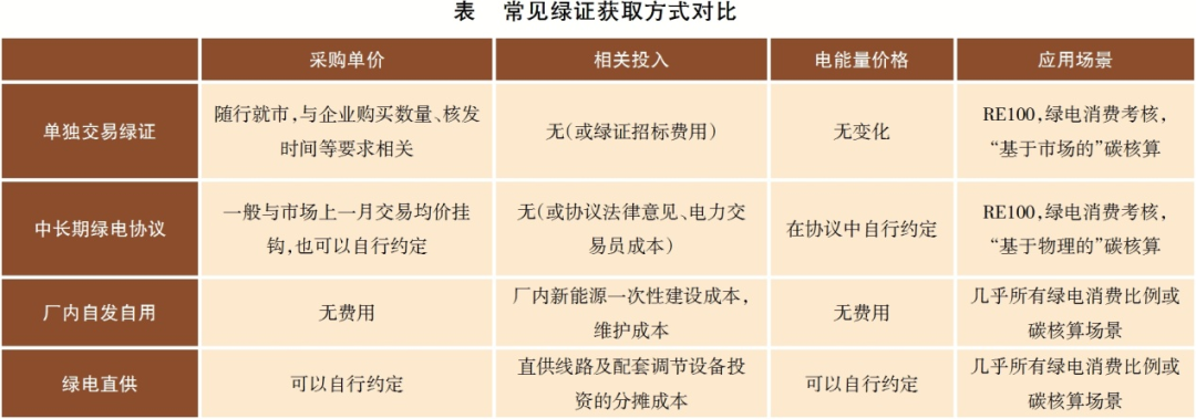 二是結(jié)合企業(yè)需求與資源條件,合理選擇綠電消費方式。2025年,電力消納責任權(quán)重文件提出“核算以綠證為主”。部分企業(yè)可能誤解為,唯有通過市場采購綠證,方可滿足政策要求。事實上,隨著綠證核發(fā)范圍基本實現(xiàn)全覆蓋,企業(yè)通過廠內(nèi)自發(fā)自用、綠電協(xié)議、綠電直連等途徑同樣可獲取綠證,各路徑在成本和應(yīng)用場景上存在差異,企業(yè)需綜合衡量利弊后進行決策。對于每年電能費用占總成本30%~40%的電解鋁企業(yè)、電能費用占比達10%~30%的化工企業(yè)、水泥企業(yè)等,可優(yōu)先考慮利用廠內(nèi)空間自建新能源,或嘗試通過風光配儲構(gòu)建綠電直連項目。對于電能費用占比較小的企業(yè),由于當前綠證市場均價僅為電能價格的1%左右,企業(yè)可結(jié)合低碳發(fā)展階段優(yōu)先選擇采購綠證或綠電(見表)。