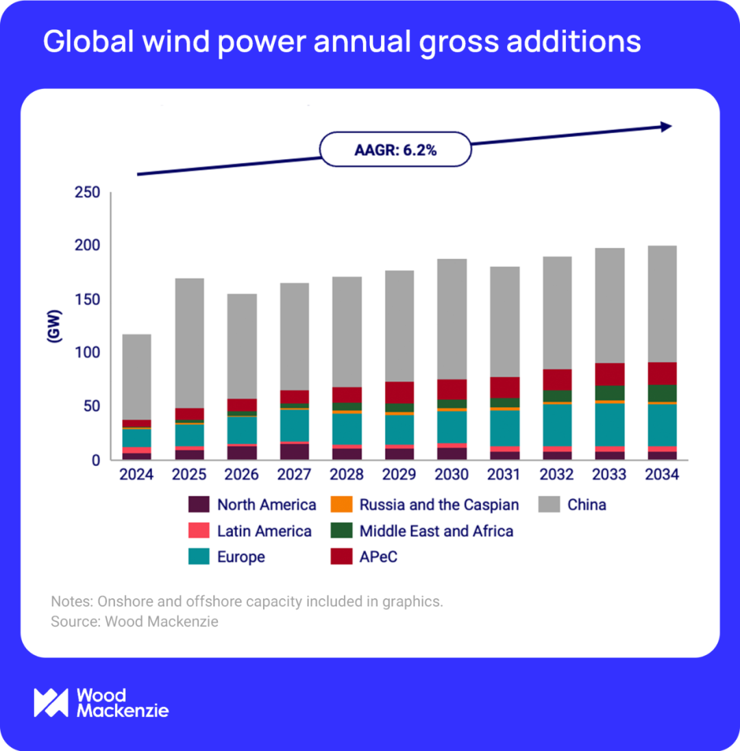 在本季度的預(yù)測(cè)中,我們將全球風(fēng)電裝機(jī)預(yù)測(cè)較上季度上調(diào)13%,主要由于中國(guó)陸上風(fēng)電市場(chǎng)預(yù)測(cè)大幅增長(zhǎng)。到2032年,全球風(fēng)電裝機(jī)容量將較2024年的水平翻倍。盡管美國(guó)等主要市場(chǎng)受政策的影響較大,但未來10年,行業(yè)仍將達(dá)到歷史性規(guī)模。在除中國(guó)外的市場(chǎng),2031年全球風(fēng)電累計(jì)裝機(jī)容量將達(dá)1TW,且到2034年全球裝機(jī)容量將較2024年水平翻倍。