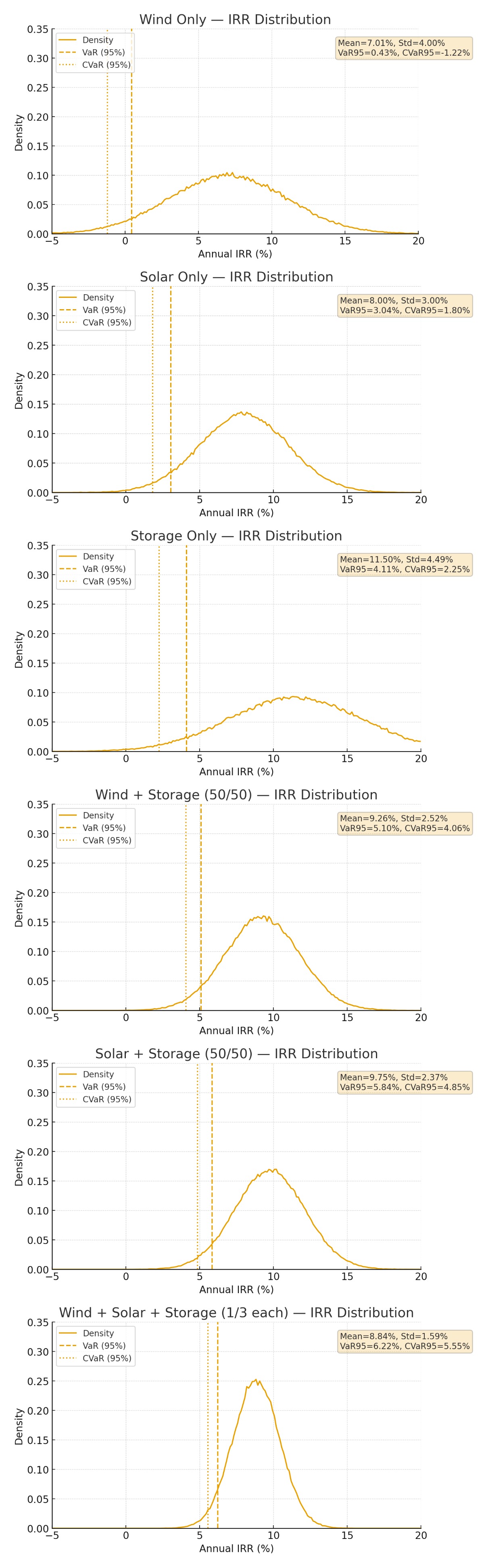 上述三類資產(chǎn)在產(chǎn)出模式上具有差異化特征:風光發(fā)電的出力與氣候條件強相關,風電在陰天或夜間發(fā)電往往較強,而光伏在晴天日間峰值輸出高;儲能則在需量低谷時充電、高峰時放電,從時序上補充風光發(fā)電的間歇性和波動性。這種互補性意味著“風光互補”可以平滑總發(fā)電曲線[8],而“儲能加持”則可對沖可再生能源出力與市場電價的高頻波動。綜合考慮現(xiàn)金流與風險:純風電或純光伏組合雖可能提供較高的年化收益,但波動性也較大;純儲能組合收益高度依賴市場條件波動同樣劇烈。實踐上,合理的資產(chǎn)組合可以利用這些差異通過對沖效應降低整體風險。