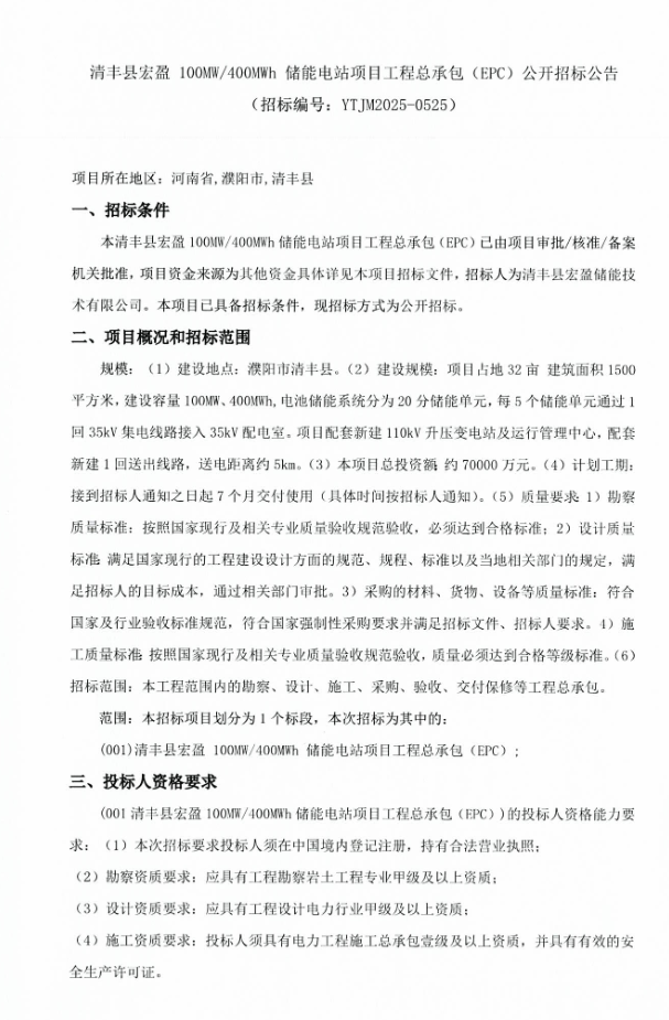 100MW/400MWh!河南省濮陽(yáng)市清豐縣儲(chǔ)能電站EPC招標(biāo)