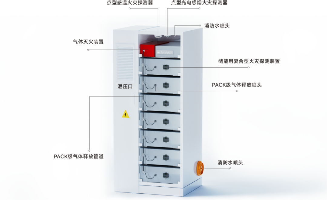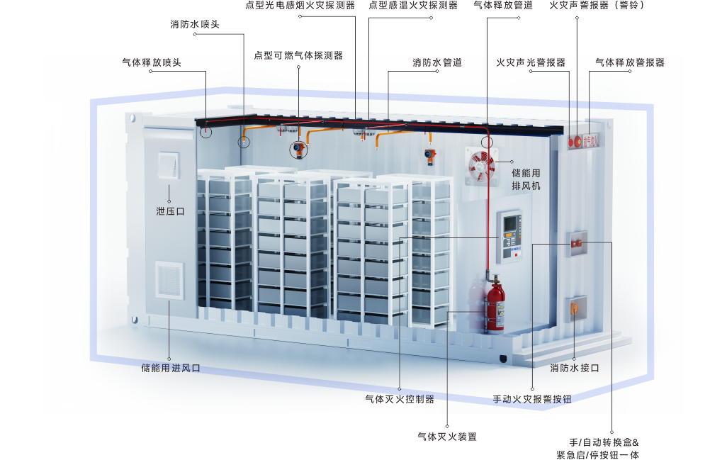 由火災(zāi)報(bào)警系統(tǒng)、可燃?xì)怏w探測系統(tǒng)、氣體滅火系統(tǒng)及消防水系統(tǒng)組成,覆蓋整個(gè)儲能艙,應(yīng)對全面熱失控風(fēng)險(xiǎn)。
