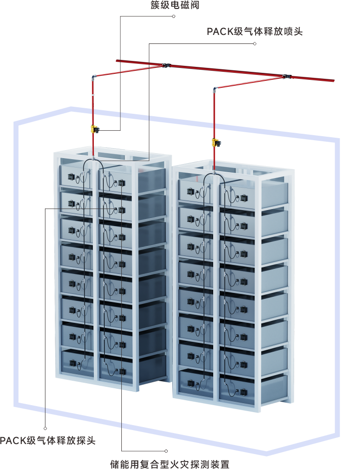以每個(gè)電池PACK或電池簇為單元,采用儲能專用復(fù)合探測器,實(shí)現(xiàn)定向滅火,早期抑制局部火情。
