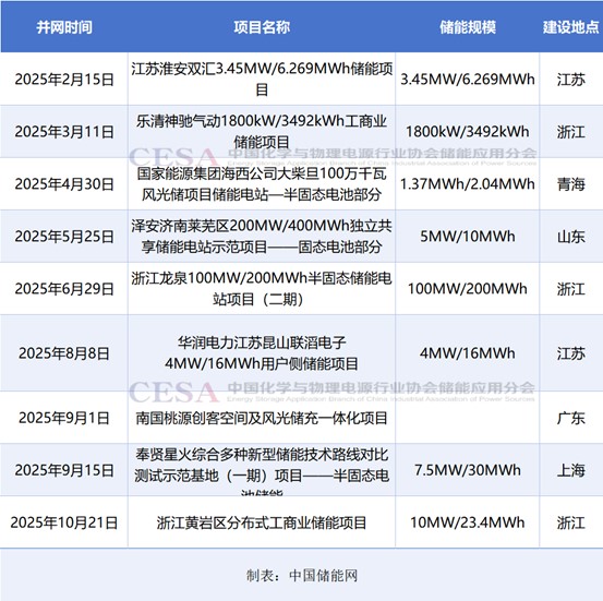 2025年1-10月國內(nèi)半固態(tài)/固態(tài)電池儲能新增并網(wǎng)項目