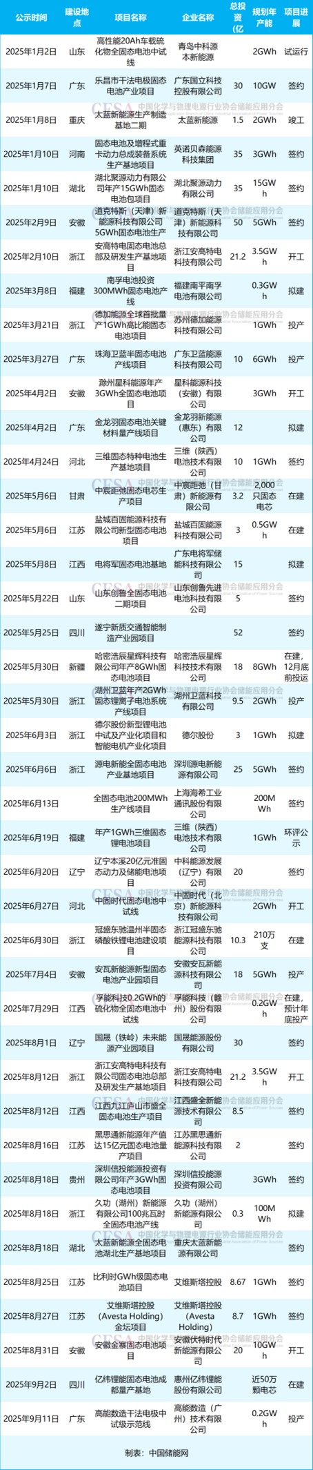 2025年1-9月國內(nèi)半固態(tài)/固態(tài)電池擴產(chǎn)項目