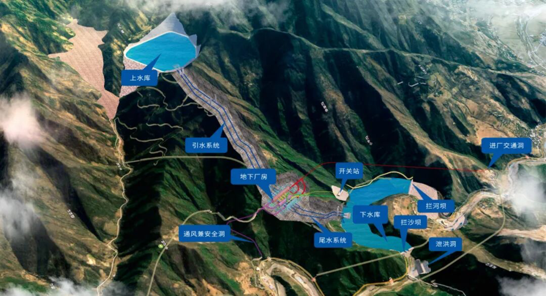 項(xiàng)目位于陜西省商洛市山陽(yáng)縣,依托自然地勢(shì),電站由上水庫(kù)、輸水系統(tǒng)、地下廠房、開關(guān)站、下水庫(kù)等構(gòu)成,安裝4臺(tái)單機(jī)容量30萬(wàn)千瓦的可逆式水泵水輪機(jī)組,在電力富余時(shí)把低處的水抽到高處儲(chǔ)能,在用電高峰時(shí)把高處的水放下發(fā)電保供,實(shí)現(xiàn)“調(diào)峰填谷”,助力電網(wǎng)平穩(wěn)運(yùn)行。