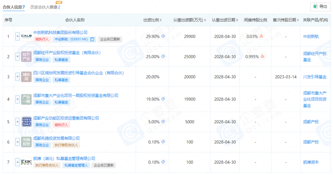 企查查顯示,凱博成都基金成立于2022年8月,出資額為10億元,其主要合伙人包括中創(chuàng)新航科技集團(tuán)股份有限公司(證券簡(jiǎn)稱“中創(chuàng)新航”)、成都經(jīng)開產(chǎn)業(yè)股權(quán)投資基金(有限合伙)、四川區(qū)域協(xié)同發(fā)展投資引導(dǎo)基金合伙企業(yè)(有限合伙)、成都市重大產(chǎn)業(yè)化項(xiàng)目一期股權(quán)投資基金有限公司、成都產(chǎn)業(yè)功能區(qū)投資運(yùn)營(yíng)集團(tuán)有限公司等。