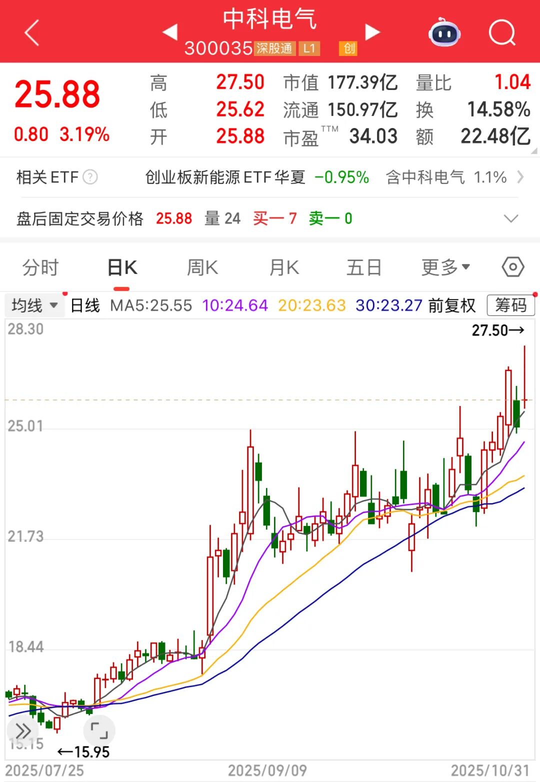 二級(jí)市場(chǎng)方面,截至10月31日收盤,中科電氣上漲3.19%,報(bào)25.88元/股,總市值177.39億元。