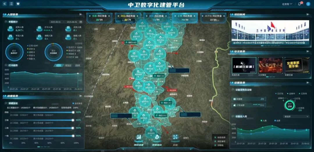 科技賦能方面,引入吊裝無人機等智能裝備,提升復(fù)雜地形條件下的作業(yè)效率;研發(fā)“中衛(wèi)數(shù)字化建設(shè)平臺”,融合離線打卡、進(jìn)度看板、環(huán)境預(yù)警與設(shè)備管理等多項功能,有效破解施工區(qū)域廣闊、網(wǎng)絡(luò)覆蓋不足帶來的管理難題,確保項目全程可控、高效推進(jìn)。