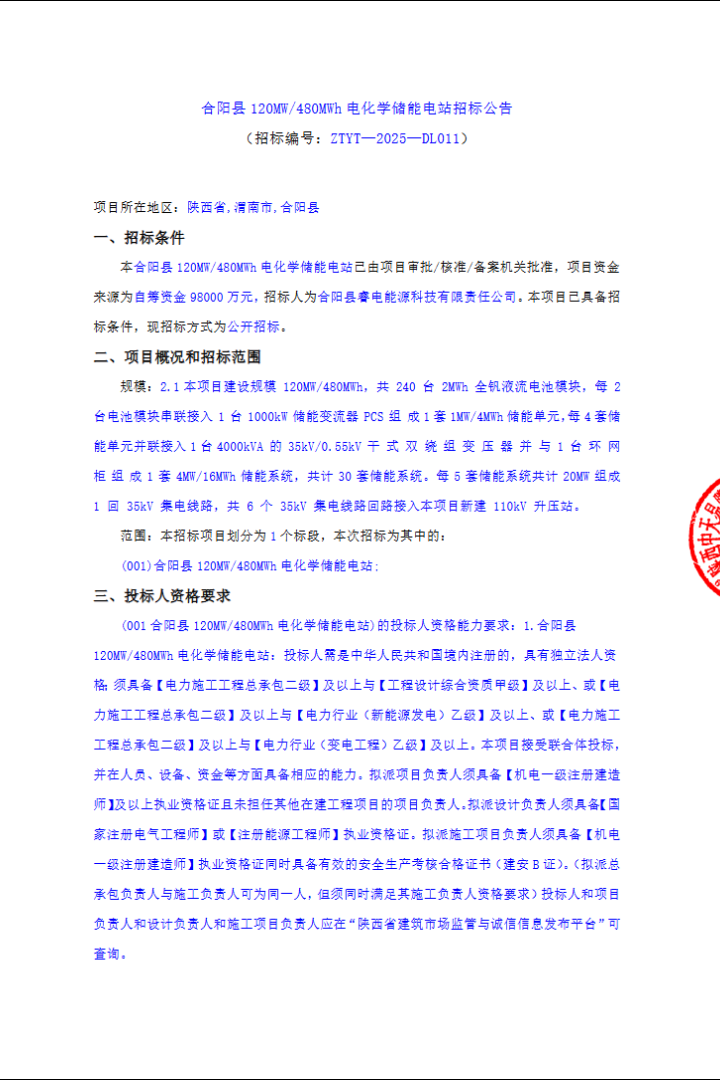 中國(guó)儲(chǔ)能網(wǎng)訊:10月31日,合陽(yáng)縣睿電能源科技有限責(zé)任公司發(fā)布“合陽(yáng)縣120MW/480MWh電化學(xué)儲(chǔ)能電站招標(biāo)公告”,資金來(lái)源為自籌,估算總投資9.8億元,相當(dāng)于單價(jià)約2元/Wh。