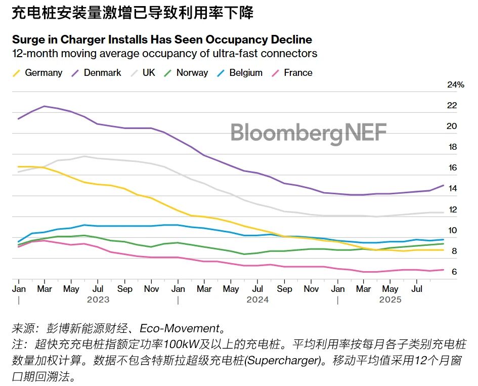 歐洲主要市場的充電樁利用率(即充電樁連接車輛的時(shí)長)普遍下降,超快充充電樁尤為顯著。安裝量激增導(dǎo)致了這一下滑,超快充網(wǎng)絡(luò)的擴(kuò)張速度已超過新能源汽車保有量增速。
