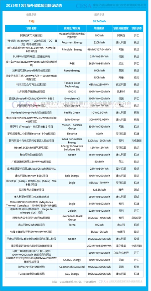 中國(guó)儲(chǔ)能網(wǎng)訊:2025年10月,CESA儲(chǔ)能應(yīng)用分會(huì)產(chǎn)業(yè)數(shù)據(jù)庫(kù)追蹤到35起海外儲(chǔ)能項(xiàng)目建設(shè)動(dòng)態(tài)事件,總規(guī)模為58.74GWh,涉及Terna、Tenevo Solar Technology、SA&CL Energy、Rondo Energy、Recurrent Energy、Principia Energy、PGE、Pacific Green、Neoen、Metlen、Karatzis Group、Masdar、EWEC、Inversiones Black Group、Giga Storage等全球能源投資方/開發(fā)商,建設(shè)地點(diǎn)位于澳大利亞、智利、意大利、雅典、匈牙利、塞爾維亞、美國(guó)、羅馬尼亞、希臘、茲別克斯坦、荷蘭等全球18個(gè)國(guó)家。