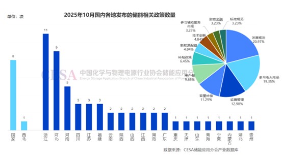 中國儲能網(wǎng)訊:據(jù)CESA儲能應用分會產(chǎn)業(yè)數(shù)據(jù)庫不完全統(tǒng)計,2025年10月份共發(fā)布儲能相關政策62項,國家層面發(fā)布7項,涉及監(jiān)督管理、技術創(chuàng)新、發(fā)展規(guī)劃、標準規(guī)范等多個方面。