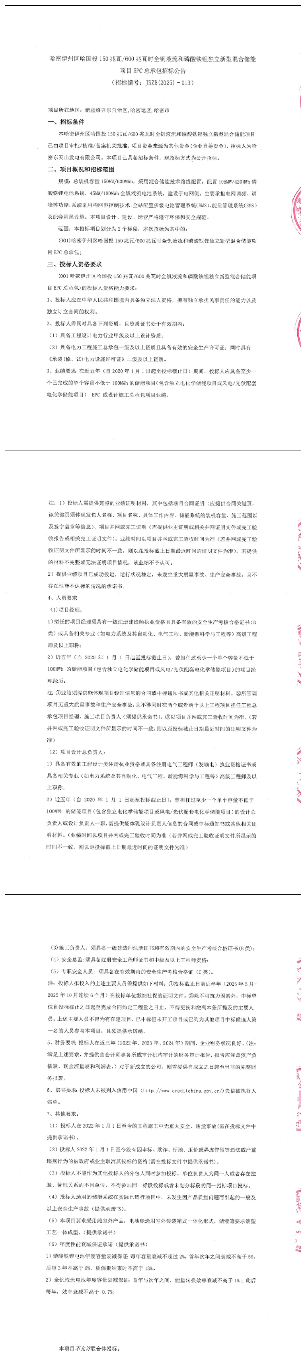 業(yè)績(jī)方面要求投標(biāo)人近五年具備至少一個(gè)已完成的單個(gè)容量不低于100MWh的儲(chǔ)能項(xiàng)目EPC或設(shè)計(jì)施工總承包業(yè)績(jī)。本項(xiàng)目不允許聯(lián)合體投標(biāo)。