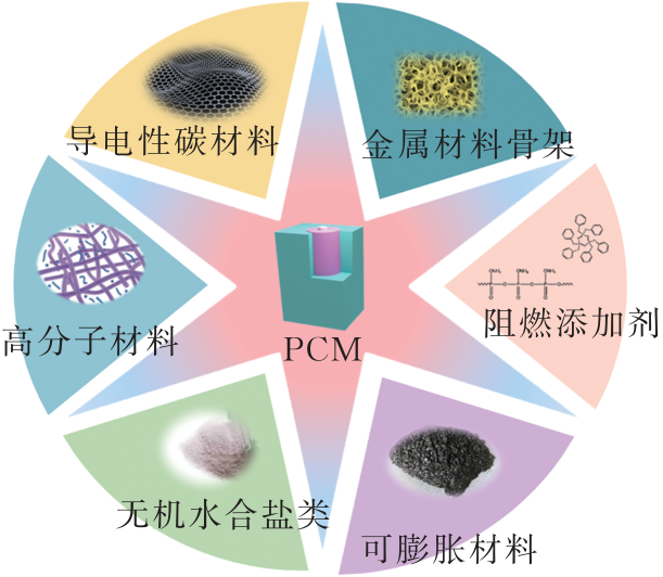 由于石墨烯等碳材料在微觀結(jié)構(gòu)上具有超強的平面熱導(dǎo)率,可達(dá)到2 000~5 000 W/(m.K),因此,向純相變材料中添加石墨烯、碳納米管等導(dǎo)電性碳材料的復(fù)合相變材料,導(dǎo)熱性提高了2個數(shù)量級,其原有的相變潛熱性能也沒有受到損失,添加金屬翅片、金屬多孔材料、金屬納米粒子也可以起到相同的作用。然而導(dǎo)熱性能的提升并沒有增大材料的相變潛熱,降低火災(zāi)危險性,因此,導(dǎo)熱增強型復(fù)合材料大多應(yīng)用于電池充放電過程中的熱管理。針對相變材料的易泄漏、易燃等局限性,將相變材料與阻燃涂層或柔性材料結(jié)合可以很好地解決這一問題。MEI J等對比了針刺與加熱方式對電池?zé)崾Э赜|發(fā)的影響,將六苯氧基環(huán)三磷腈(HPCP)添加在石蠟相變材料中,HPCP分子中的苯氧基團(tuán)在高溫條件下解離,并發(fā)生歧化反應(yīng),產(chǎn)生的苯氧基及其歧化產(chǎn)物具有淬滅效應(yīng),通過氣相阻燃有效降低電池?zé)崾Э氐幕鹧娓叨群突鹧鏈囟?。LIU Q等以石蠟為相變材料基體,采用硫化橡膠將阻燃涂層粘附在相變材料表面,并采用聚磷酸銨作為氣相阻燃材料,電池發(fā)生熱失控時,改性石蠟會膨脹吸收大量熱量并產(chǎn)生蓬松的炭層,聚磷酸銨持續(xù)熱解產(chǎn)生的焦磷酸和聚偏磷酸沉積在炭層中,進(jìn)一步隔絕氧氣,在抑制電池?zé)崾Э財U散的同時解決了相變材料易泄漏流動和易燃的問題。