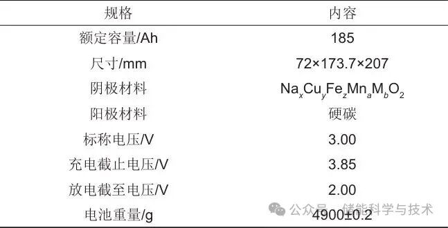 本研究選用標(biāo)稱容量為185 Ah的商用方形鈉離子電池作為測(cè)試對(duì)象。該電池采用層狀氧化物NaxCuyFezMnaMbO2(其中,M包括Li、Ni、Mg、Zn、Co、Al、Zr和Ti中的至少一種,0.6<x<1.2,0<y<0.5,0<z≤0.5,0<a≤0.8,0≤b≤0.5,且y+z+a+b=1)作為正極材料,硬碳作為負(fù)極材料。電池的詳細(xì)規(guī)格參數(shù)列于表1。在實(shí)驗(yàn)預(yù)處理階段,所有電池樣品均通過(guò)充放電測(cè)試儀以CC-CV(恒流-恒壓)模式進(jìn)行充電。為確保電池化學(xué)性質(zhì)穩(wěn)定性并建立可靠的基準(zhǔn)數(shù)據(jù),實(shí)驗(yàn)前對(duì)所有電池樣品進(jìn)行了三次完整的充放電循環(huán)。實(shí)驗(yàn)開始前,所有電池均充至100%荷電狀態(tài)(SOC),以模擬實(shí)際應(yīng)用中的標(biāo)準(zhǔn)工作條件。