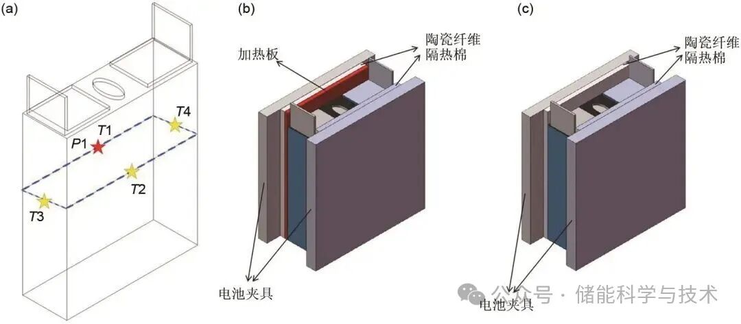 圖1 (a) 熱電偶和膨脹力傳感器的布置示意圖 (T:熱電偶測(cè)量點(diǎn);P:膨脹力傳感器測(cè)量點(diǎn));(b) 電池結(jié)構(gòu)及試驗(yàn)1測(cè)試裝置的示意圖;(c) 電池結(jié)構(gòu)及試驗(yàn)2測(cè)試裝置的示意圖