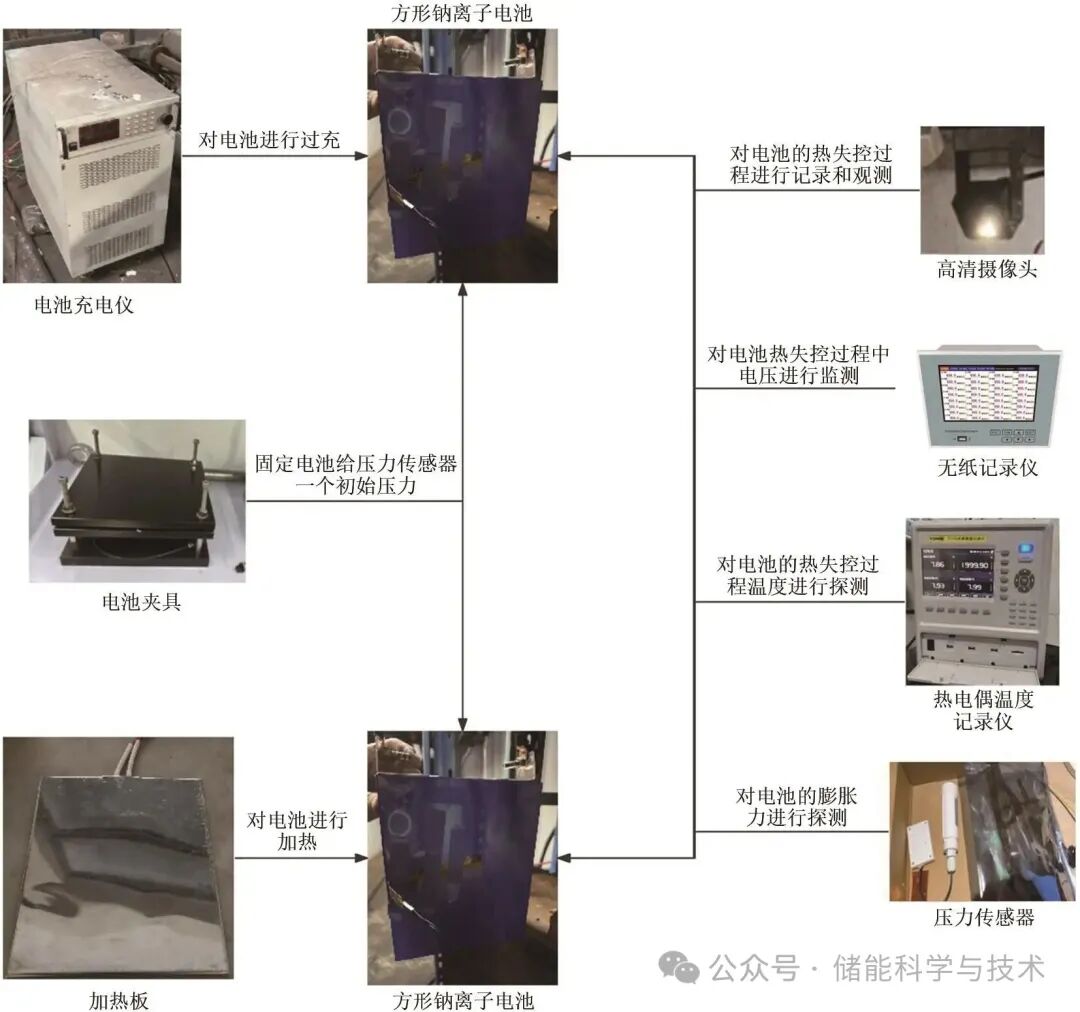 目前對(duì)鈉離子電池安全性的研究主要關(guān)注其熱行為特性。Li等探究了鈉離子電池中帶電層狀氧化物正極的熱分解機(jī)制,發(fā)現(xiàn)鋰摻雜通過(guò)抑制過(guò)渡金屬離子溶出和減少氧氣釋放,有效提升了熱穩(wěn)定性。他們建立的動(dòng)力學(xué)三要素模型為開發(fā)更安全的電池材料提供了理論基礎(chǔ)。Rui等通過(guò)球形壓痕測(cè)試結(jié)合多物理場(chǎng)計(jì)算模型,研究了鈉離子電池在機(jī)械濫用條件下的安全性能與失效機(jī)制。研究表明,與鋰離子電池相比,鈉離子電池呈現(xiàn)出較緩慢的內(nèi)短路觸發(fā)過(guò)程和顯著較低的內(nèi)短路溫度,證實(shí)其在機(jī)械負(fù)載下具有更高的安全邊際。Li等系統(tǒng)比較了鈉離子電池與鋰離子電池在不同加熱功率下的熱失控行為,發(fā)現(xiàn)隨著加熱功率增加,鈉離子電池的熱危害顯著增加而氣體產(chǎn)生危害減少。鈉離子電池的整體熱失控危害程度介于NCM523和LFP電池之間,且不會(huì)自發(fā)燃燒,凸顯了鈉基能源存儲(chǔ)系統(tǒng)的研究?jī)r(jià)值。Li等考察了不同荷電狀態(tài)下大型棱柱形鈉離子電池的熱失控行為,發(fā)現(xiàn)較高的荷電狀態(tài)會(huì)導(dǎo)致更嚴(yán)重的熱危害,其中氫氣在排出氣體中的比例高達(dá)42%。研究人員還觀察到一種自熄滅現(xiàn)象,即熱失控過(guò)程中產(chǎn)生的強(qiáng)烈氣體能有效分散熱量并將可燃?xì)怏w與氧氣和火花隔離。Teng等研究了鈉離子電池(SIBs)從材料到電池級(jí)別的熱穩(wěn)定性和安全特性,揭示了固體電解質(zhì)界面(SEI)分解在100 ℃以下就開始發(fā)生,正極材料(NaxNi1/3Fe1/3Mn1/3O2)與電解液之間的反應(yīng)構(gòu)成了熱濫用過(guò)程中的主要放熱事件,且熱量產(chǎn)生與氣體生成行為不一定相關(guān)。Mei等對(duì)鋰離子電池和鈉離子電池的熱安全性進(jìn)行了全面比較,通過(guò)加速量熱儀測(cè)試發(fā)現(xiàn)磷酸鐵鋰(LFP)電池展現(xiàn)出最低的熱失控風(fēng)險(xiǎn)和嚴(yán)重程度,鈉離子電池的熱穩(wěn)定性與LFP相當(dāng),但具有最低的安全排氣溫度和最長(zhǎng)的排氣到熱失控的時(shí)間間隔,有利于及早預(yù)警??傮w而言,LFP電池的熱危害最低,其次是鈉離子電池,再次是三元材料(NCM523)電池。然而,這些研究大多局限于單一濫用條件下的表現(xiàn),難以全面反映實(shí)際應(yīng)用中大容量鈉離子電池的熱失控行為特征。不同濫用條件下,如過(guò)熱和過(guò)充等情況下的熱失控機(jī)理和表現(xiàn)形式存在顯著差異,亟需進(jìn)行系統(tǒng)性研究。在實(shí)際應(yīng)用環(huán)境中,鈉離子電池可能面臨多種濫用條件,其中過(guò)熱和過(guò)充是最為常見的兩種情況。過(guò)熱通常源于外部熱源、短路或環(huán)境溫度過(guò)高,而過(guò)充則主要由電池管理系統(tǒng)故障或充電控制失效引起。這兩種濫用條件不僅在觸發(fā)機(jī)制上存在差異,其誘發(fā)的熱失控過(guò)程和表現(xiàn)形式也呈現(xiàn)出明顯不同。目前關(guān)于大容量商用鈉離子電池在這兩種濫用條件下熱失控行為的對(duì)比研究尚不充分,尤其缺乏對(duì)熱失控過(guò)程中溫度分布、電壓變化和膨脹力演變等關(guān)鍵參數(shù)的系統(tǒng)監(jiān)測(cè)與分析。