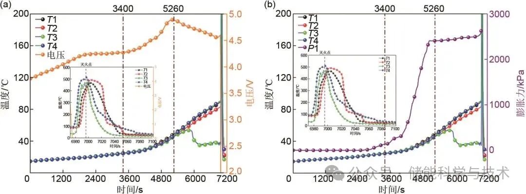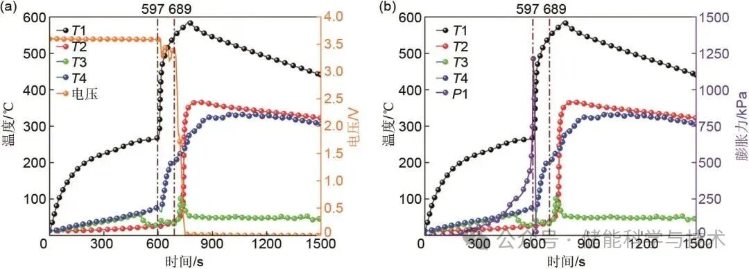 圖5 過(guò)充條件下鈉離子電池?zé)崾Э靥卣鲄?shù)變化曲線:(a) 溫度與電壓變化曲線;(b) 溫度與膨脹力變化曲線