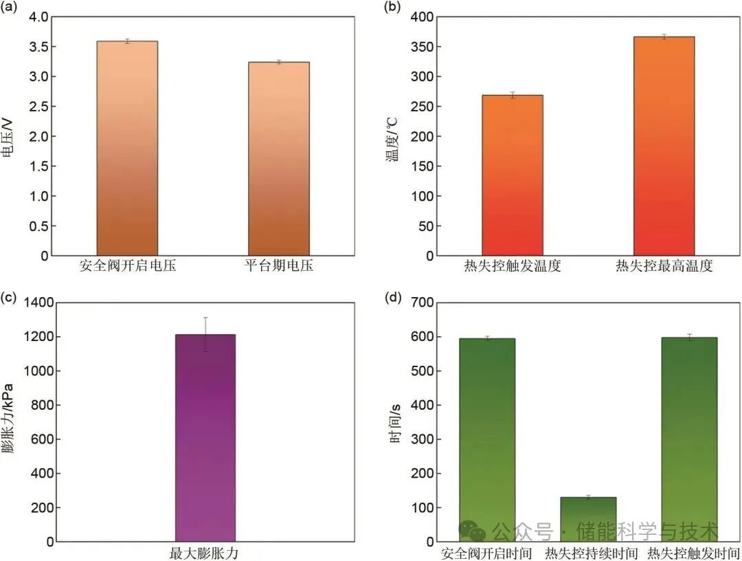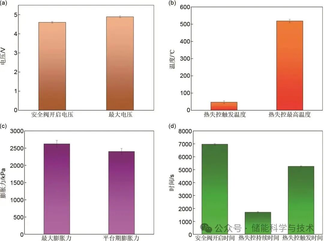本實(shí)驗(yàn)進(jìn)行了兩次重復(fù)性測(cè)試以驗(yàn)證結(jié)論的可靠性。實(shí)驗(yàn)結(jié)果表明,所獲得的數(shù)據(jù)與曲線與圖3呈現(xiàn)高度一致性,這進(jìn)一步證實(shí)了測(cè)試方法的穩(wěn)定性與可重現(xiàn)性。圖4中的誤差棒圖量化了熱失控關(guān)鍵參數(shù)的離散程度:時(shí)間維度上觀察到約±5 s的標(biāo)準(zhǔn)偏差,這可歸因于觸發(fā)機(jī)制的微小延遲以及數(shù)據(jù)采集系統(tǒng)的響應(yīng)時(shí)間;電壓參數(shù)表現(xiàn)出±0.025 V的波動(dòng),這主要源于不同電池樣本間內(nèi)阻的固有差異,符合生產(chǎn)工藝的正常波動(dòng)范圍;溫度參數(shù)方面記錄到±10 ℃的測(cè)量不確定度,這與熱電偶位置的微小變化及環(huán)境溫度的波動(dòng)相關(guān);膨脹力方面測(cè)得±40 kPa的誤差值,這反映了電池結(jié)構(gòu)完整性及內(nèi)部氣體生成動(dòng)力學(xué)的樣本間差異。上述誤差均在實(shí)驗(yàn)預(yù)期范圍內(nèi),不影響對(duì)熱失控行為特征及安全閾值的總體判斷。