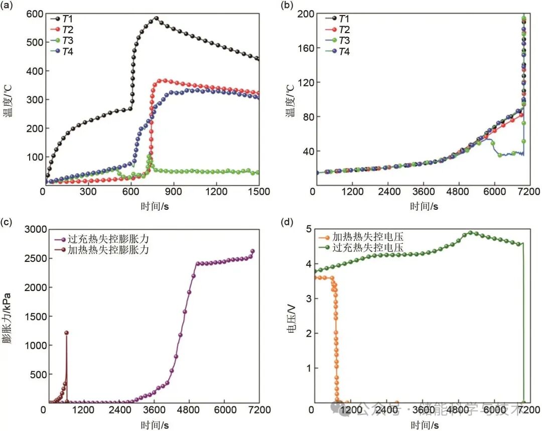 圖7 不同濫用條件下鈉離子電池?zé)崾Э匦袨樘匦詫?duì)比:(a) 加熱熱失控溫度變化曲線;(b) 過(guò)充熱失控溫度變化曲線;(c) 不同濫用條件下膨脹力變化曲線;(d) 不同濫用條件下電壓變化曲線