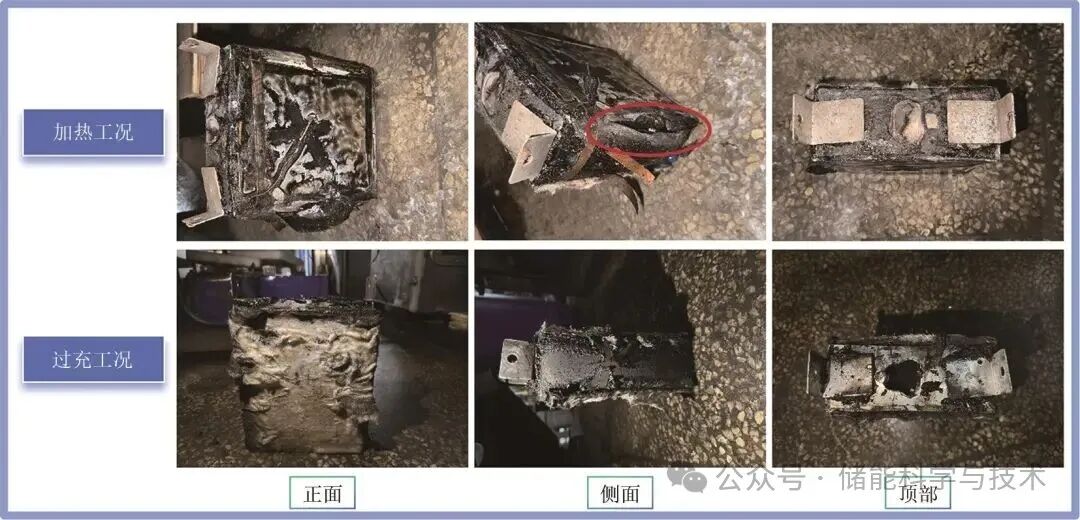 (3)失效模式分析表明:加熱條件下電池安全閥區(qū)域保持相對(duì)完整性,主要破壞集中于熱面區(qū)域;而過(guò)充條件下安全閥區(qū)域遭受嚴(yán)重破壞,這進(jìn)一步證實(shí)了不同濫用條件下熱失控的擴(kuò)展路徑與釋能方式存在本質(zhì)差異,對(duì)鈉離子電池安全設(shè)計(jì)提出了差異化優(yōu)化要求。