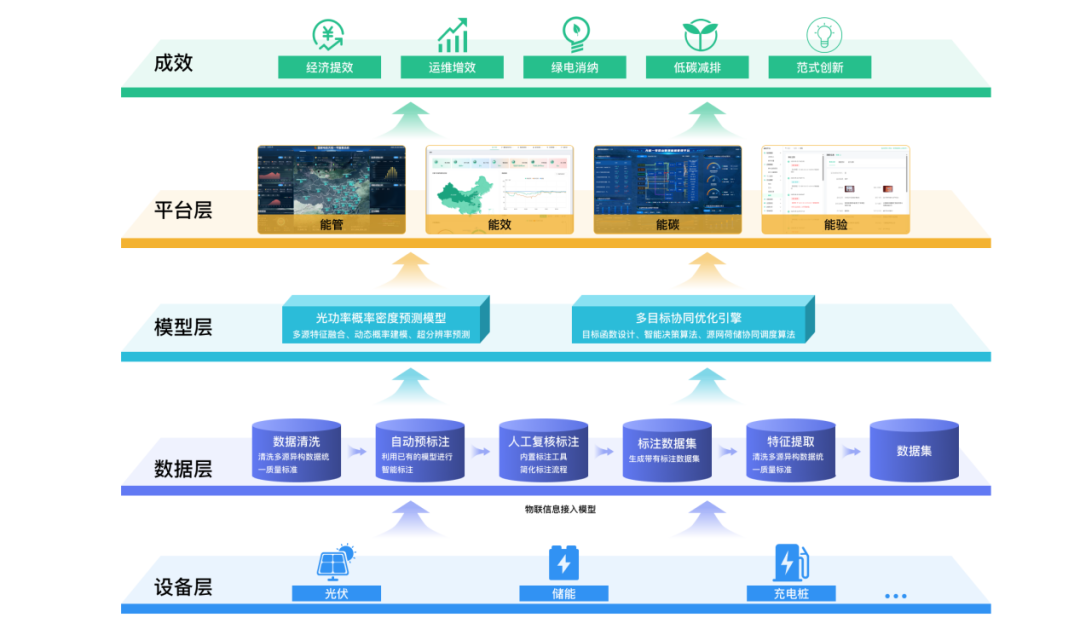 三是開發(fā)AI驅動的數據建模與優(yōu)化技術?;谔鞓衅脚_調用光儲充一體化綜合能源高質量數據集,融合多源特征和氣象特征與光功率概率密度函數的映射關系,開發(fā)光功率概率密度預測模型,實現光伏發(fā)電92%的預測準確率,顯著優(yōu)于行業(yè)平均水平。同時,構建了多目標協(xié)同優(yōu)化引擎,實現綜合能源效率提升10%。