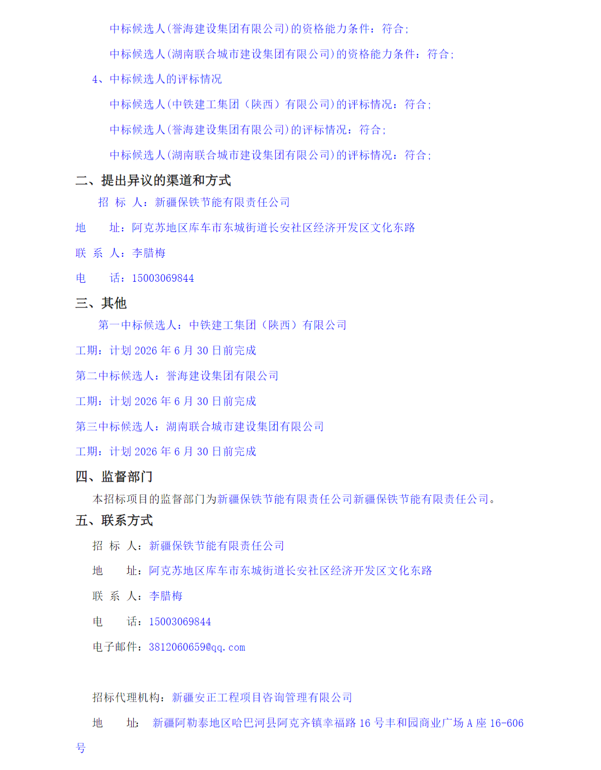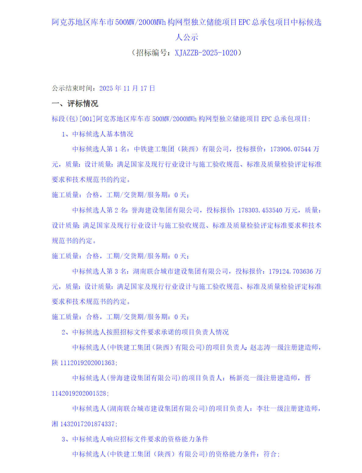 第一中標(biāo)候選人為中鐵建工集團(tuán)(陜西)有限公司,投標(biāo)報(bào)價(jià)為173906.08萬(wàn)元,折合單價(jià)為0.8695元/Wh;第二中標(biāo)候選人為譽(yù)海建設(shè)集團(tuán)有限公司,投標(biāo)報(bào)價(jià)為178303.45萬(wàn)元,折合單價(jià)為0.8915元/Wh;第三中標(biāo)候選人為湖南聯(lián)合城市建設(shè)集團(tuán)有限公司,投標(biāo)報(bào)價(jià)為179124.7萬(wàn)元,折合單價(jià)為0.8956元/Wh。