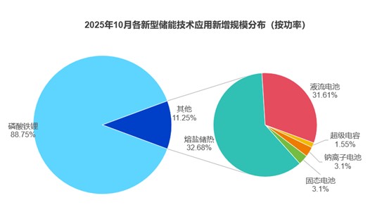 儲能技術(shù)路線方面,10月新增投運儲能項目中,磷酸鐵鋰電池儲能技術(shù)并網(wǎng)規(guī)模為2.55GW/6.15GWh,功率規(guī)模占比88.75%。