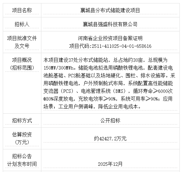 項目招標人為襄城縣強盛科技有限公司,本項目建設37處分布式儲能站,總占地約30畝,總規(guī)模為150MW/300MWh。儲能電池擬選用磷酸鐵鋰電池,配套建設電池艙基礎、PCS艙基礎以及場地硬化、圍欄、排水設施等。采用磷酸鐵鋰電池,戶外預制艙式布局,系統(tǒng)配置高性能儲能變流器(PCS)、電池管理系統(tǒng)(BMS),循環(huán)壽命≥6000次@80%深度放電,充放電效率≥90%,系統(tǒng)可用率≥90%;應用場景:工業(yè)用戶側(cè)調(diào)峰,降低企業(yè)用電成本。
