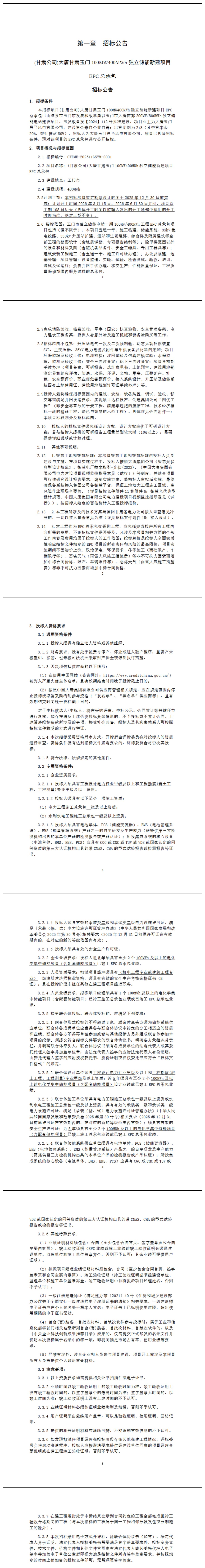 中國(guó)儲(chǔ)能網(wǎng)訊:11月18日,(甘肅公司)大唐甘肅玉門(mén)100MW/400MWh獨(dú)立儲(chǔ)能新建項(xiàng)目EPC總承包招標(biāo)公告正式發(fā)布。該項(xiàng)目業(yè)主為大唐玉門(mén)昌馬風(fēng)電有限公司,建設(shè)資金來(lái)自企業(yè)自籌(資本金20%、銀行貸款80%),招標(biāo)人為大唐玉門(mén)昌馬風(fēng)電有限公司,項(xiàng)目已具備招標(biāo)條件,現(xiàn)對(duì)其EPC總承包進(jìn)行公開(kāi)招標(biāo)。