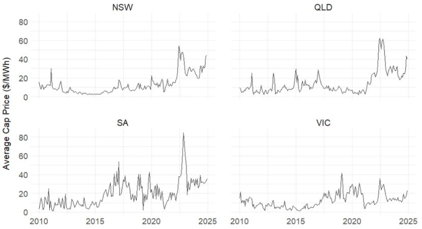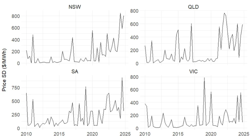 其一,電力市場波動性正在加劇。一方面,價格上限大幅提升,從2010年的10,000美元/兆瓦時升至2025年的20,300美元/兆瓦時。同時,價格觸及上限頻率明顯增加。2018年前各州電價全年未觸頂,近年卻已成為常態(tài)。另一方面,電價波動幅度持續(xù)擴大。除極端事件外,近年電價的季度標準差也普遍高于2018年前水平。圖1顯示,南澳大利亞州(SA)電價標準差在四個地區(qū)中最高,峰值超過750 $/MWh,波動最為劇烈。