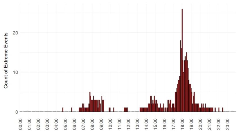 此外,波動發(fā)生時段更難預測。以往波動集中于傍晚高峰,如今已擴展至全天隨機發(fā)生。2024年更是出現(xiàn)下午2至3點的新聚集時段。圖2表明,當年極端價格事件在16:00至18:00達到峰值。這種變化加大零售商的對沖需求與成本。