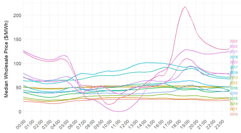 其三,鴨形曲線正在加劇。太陽能發(fā)電在電網(wǎng)中的滲透率提升正改變電價與需求特征。由于太陽能發(fā)電集中于中午,無法匹配傍晚高峰需求,導致白天電力供應過剩、價格趨近于零甚至為負。而在傍晚需求激增時段,剩余發(fā)電機被推高價格。如圖4所示,各年份電價曲線均呈現(xiàn)典型鴨形結構。電價在清晨與深夜較低,白天整體較高,并于19:00至20:00形成顯著尖峰。2021年與2024年該峰值尤為突出。這種曲線使每日成本嚴重偏向傍晚高峰時段,推高整體供電成本。為應對此類結構變化,零售商需采用更復雜的需求形態(tài)或負荷跟蹤對沖工具,從而增加風險管理的復雜性與成本。