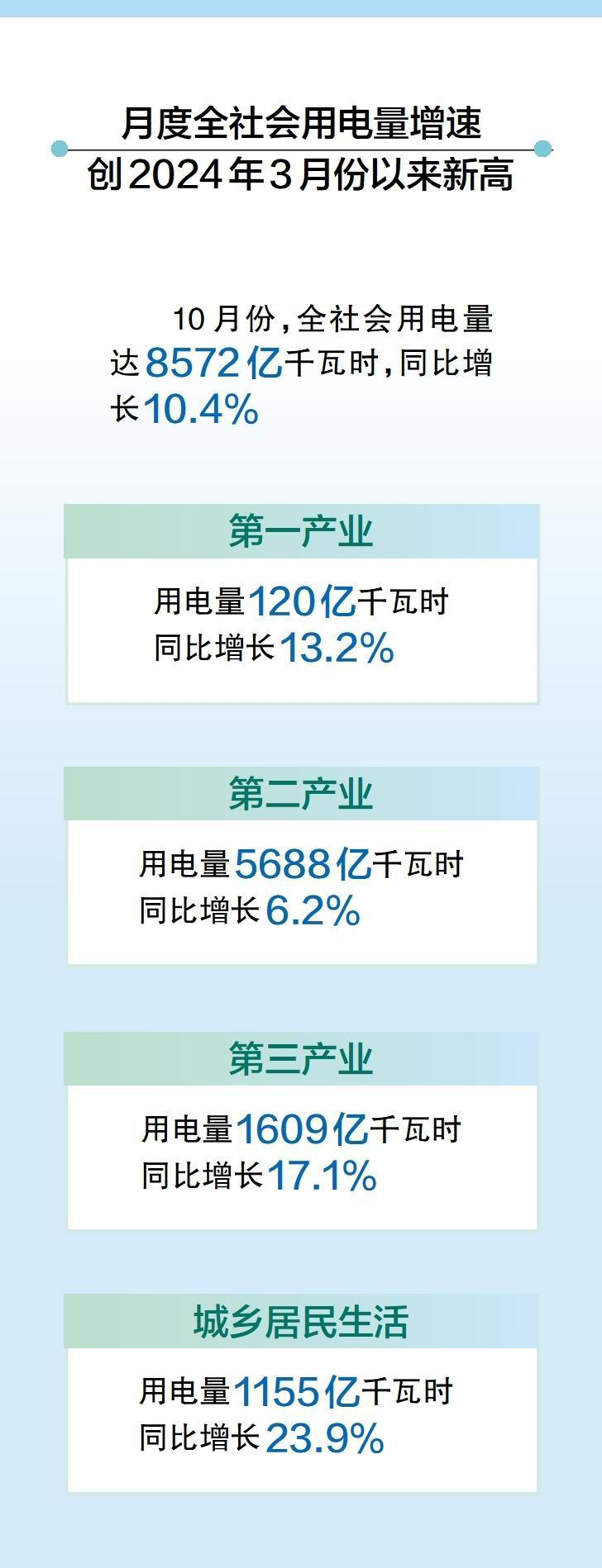 從電力消費看,10月份,全社會用電量達8572億千瓦時,同比增速達10.4%。國網(wǎng)能源研究院經(jīng)濟與能源供需研究所專家張莉莉介紹,這一增速創(chuàng)下2024年3月份以來月度全社會用電量增速新高。分產(chǎn)業(yè)看,10月份第一產(chǎn)業(yè)用電量為120億千瓦時,同比增長13.2%;第二產(chǎn)業(yè)用電量為5688億千瓦時,同比增長6.2%;第三產(chǎn)業(yè)用電量達1609億千瓦時,同比增長17.1%,其中,充換電服務(wù)業(yè)以及信息傳輸、軟件和信息技術(shù)服務(wù)業(yè)用電量增長較快;城鄉(xiāng)居民生活用電量達1155億千瓦時,同比增長23.9%。