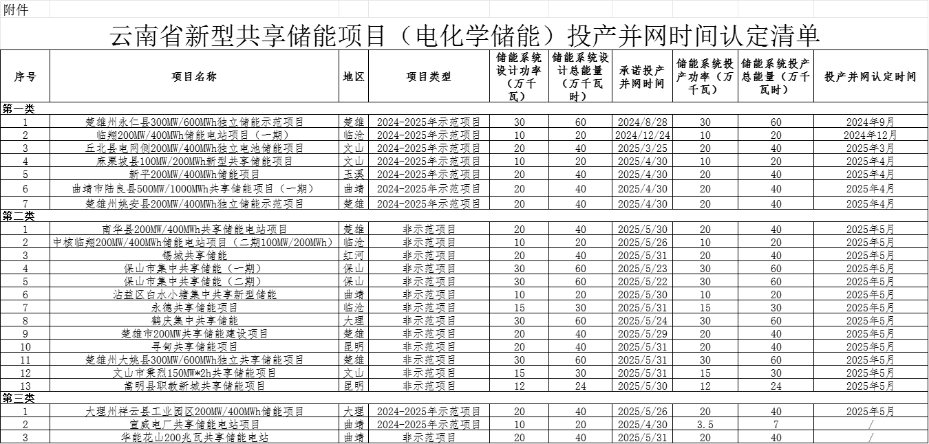 云南省能源局關(guān)于印發(fā)新型共享儲(chǔ)能項(xiàng)目(電化學(xué)儲(chǔ)能)投產(chǎn)并網(wǎng)時(shí)間認(rèn)定清單的通知
