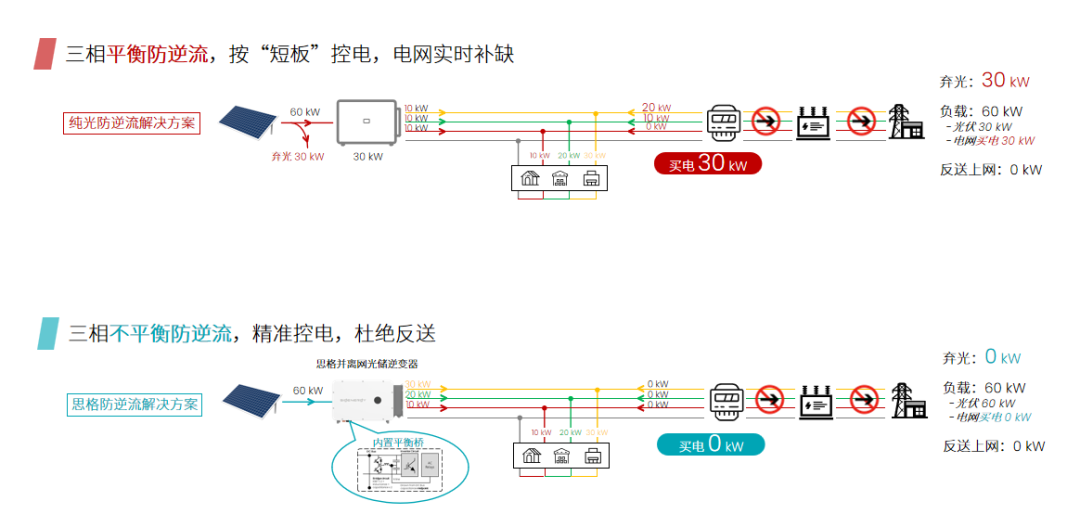 由于工商業(yè)負載往往天然“三相不平衡”:用電設備部分使用單相電源,部分使用三相電源,設備開啟時間和用電功率存在差異,很難保障三相用電負載相同,可能出現(xiàn)三相分別為 30 kW、20 kW、10 kW 這樣的情況。在防逆流場景下,傳統(tǒng)逆變器無法按需分配功率,系統(tǒng)只能按照最小相來限制整體輸出,剩余用電需要從電網取電。