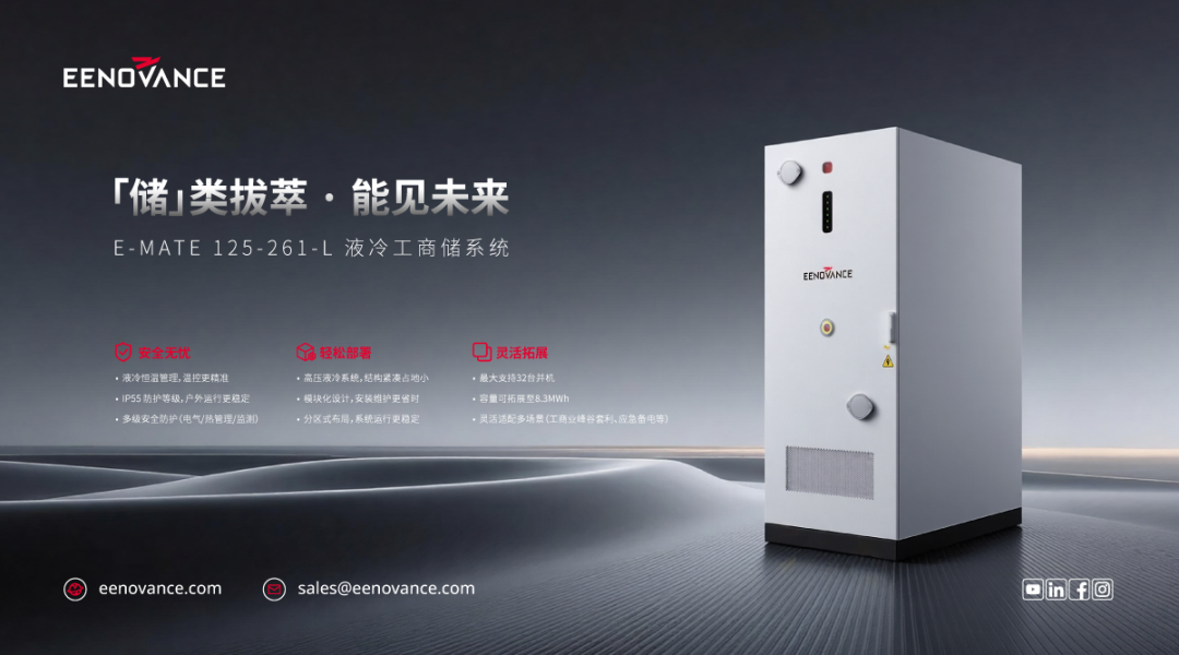 本次通過測試的E-MATE 125–261-L 液冷工商業(yè)儲能系統(tǒng)具備高效率、高安全與高擴展性的綜合優(yōu)勢。系統(tǒng)采用液冷溫控技術(shù),使電池在適宜溫區(qū)內(nèi)運行,從而有效降低衰減速率、提升循環(huán)壽命,即便在高溫、高負荷等極端環(huán)境下仍能保持穩(wěn)定輸出性能,保障項目全生命周期收益。