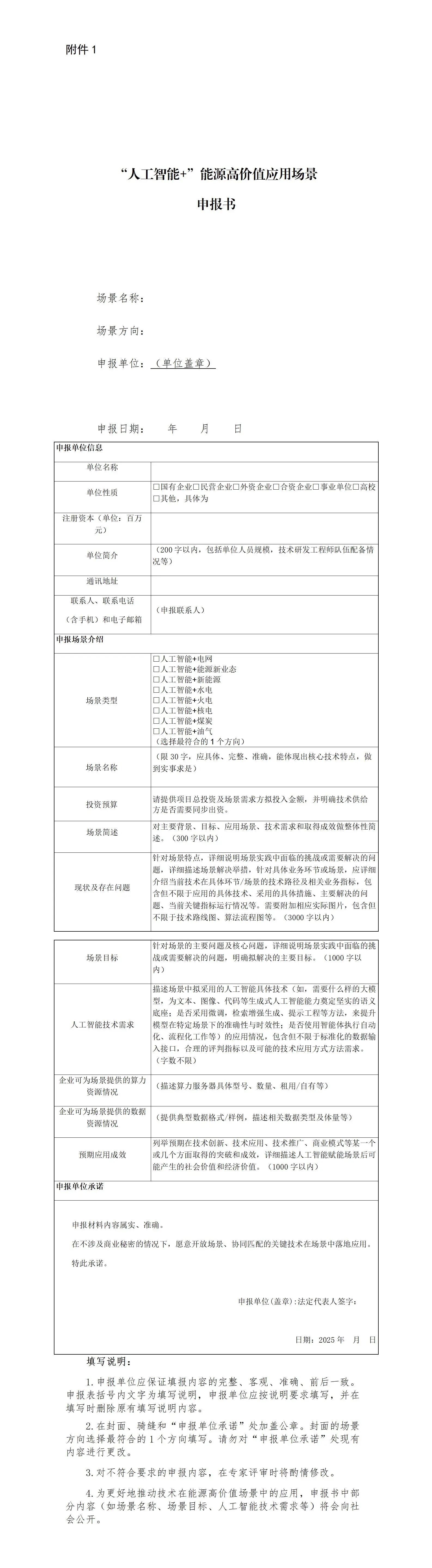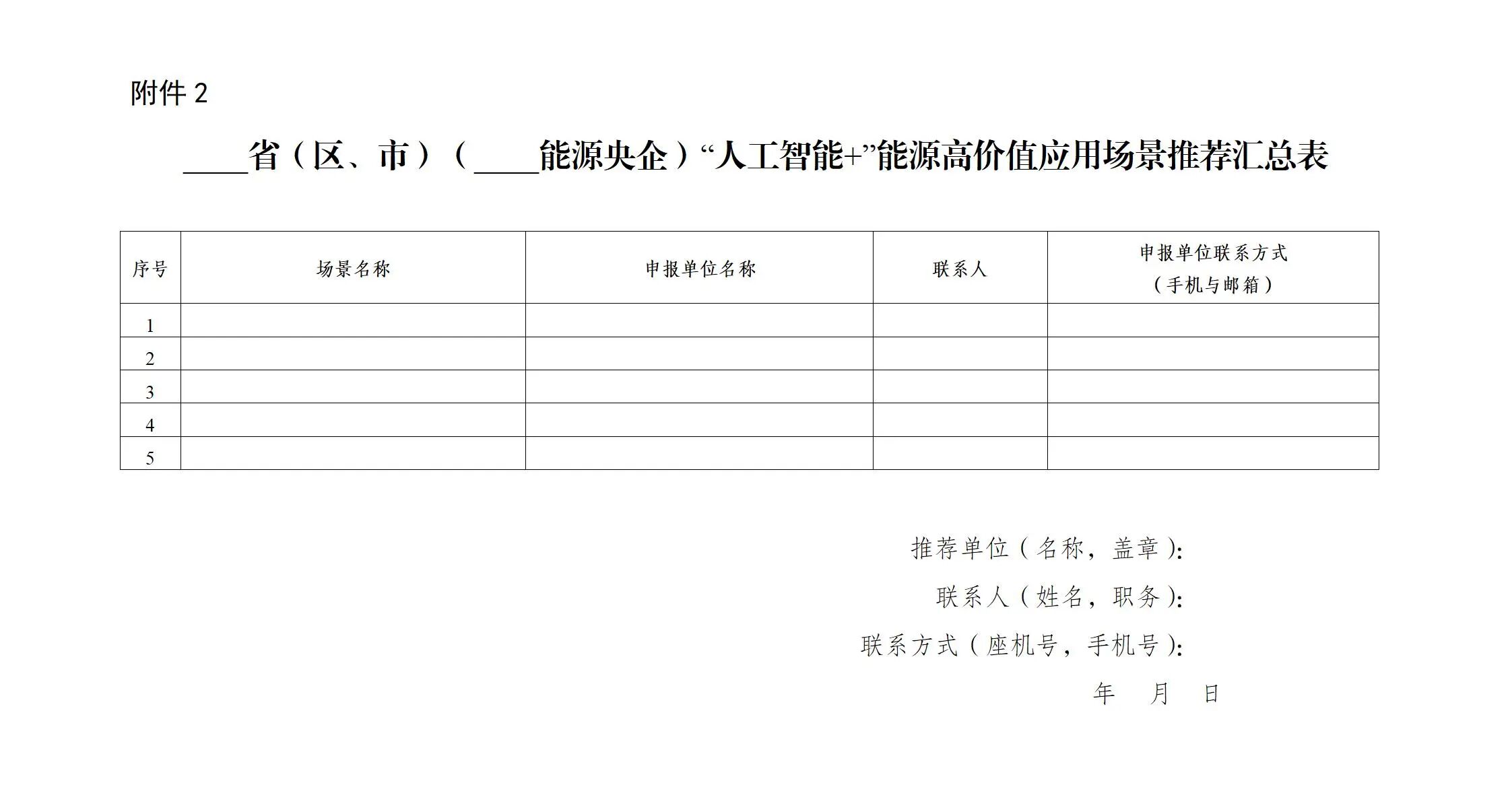 4.請各省級能源主管部門、中央企業(yè)于2025年12月29日前將高價值應用場景申報書(詳見附件1)、推薦匯總表(詳見附件2)蓋章件一式三份紙質版及電子版(光盤刻錄)寄送至國家能源局科技司。申報場景命名規(guī)則為“推薦地區(qū)/單位名稱-序號-場景名稱”(序號與推薦匯總表一致)。